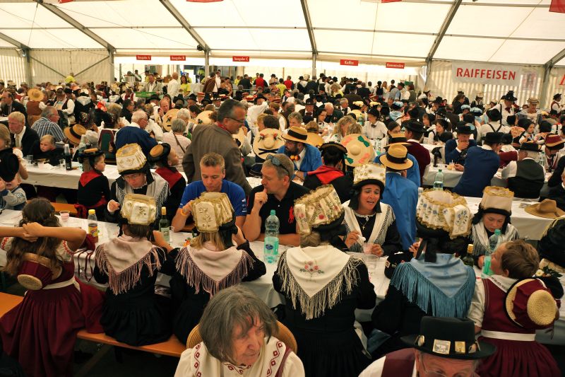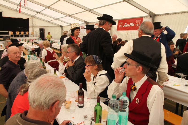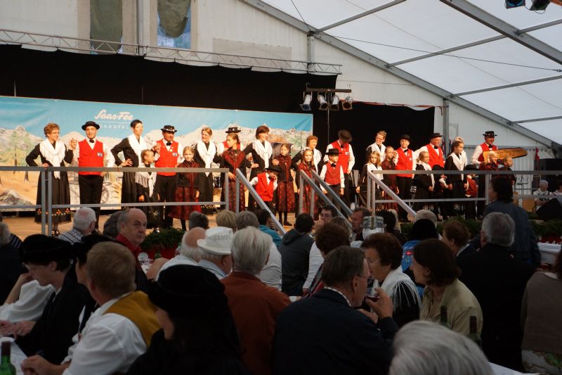 Am Nachmittag fand die Jahresversammlung der IVfW statt, die wegen des gedrängten Programms auf die sonst ausgedehnten Diskussionen verzichten musste und sich auf das Notwendigste beschränkte. Die Berichte der Vorstandsmitglieder und der Jahresbericht des Präsidenten zeigten auf, welche Tätigkeitsfülle der einzelnen Walsergebiete das Berichtsjahr umfasste. Dr. Max Waibel regte anschliessend in seinem fundierten Vortrag „Auf den Walserspuren von Mattmark nach Zermatt“ zu einer interessanten Wanderung an und vermittelte mit seinen Ausführungen kostbares Hintergrundwissen. Bernhard Andenmatten rückte den spirituellen Weg von Domodossola über den Antronapass ins Aastal in den Mittelpunkt seines Vortrags und untermalte seine Ausführungen wie sein Vorredner mit treffenden Bildern. Am Abend ging im Festzelt der Saaser Unterhaltungsabend mit Nachtessen und zahlreichen Auftritten verschiedener Musik- und Tanzgruppen im grossen Festzelt über die Bühne.