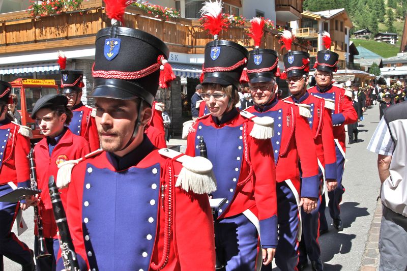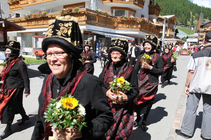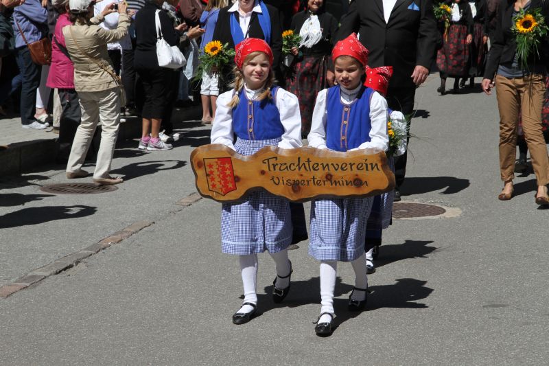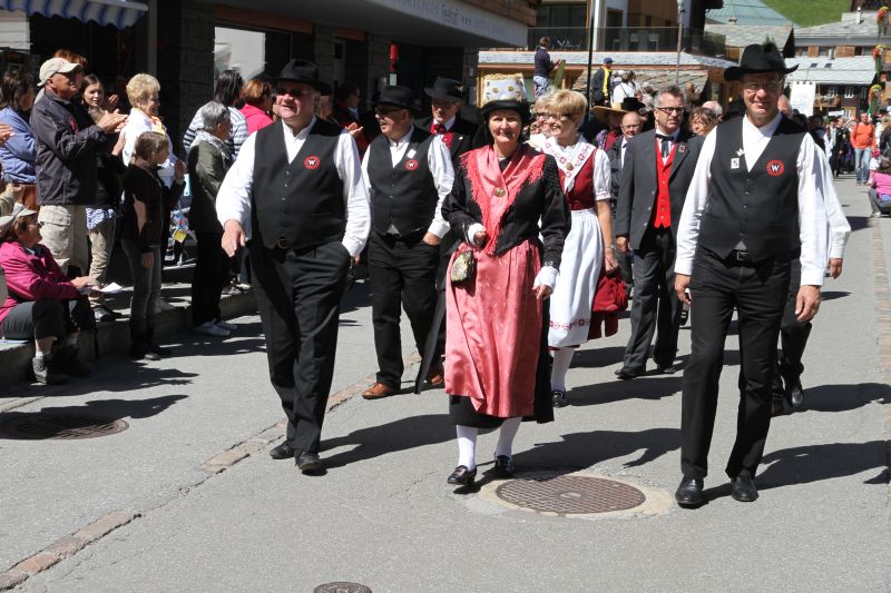 Der Sonntag begann mit dem Festgottesdienst im Festzelt. Nach dem Mittagessen stellten sich die zahlreichen Vereine des kantonalen Trachtenfestes zum Umzug auf. Auch verschiedene Walser Gruppen, darunter die VWV und die Triesenberger Trachtengruppe, wirkten mit. Bei strahlendem Wetter wurde der Umzug zu einem farbenprächtigen Erlebnis für Auge und Ohr. Es wurde auch ausgiebig musiziert und getanzt. Die teilnehmenden Walserinnen und Walser äusserten sich zufrieden und begeistert von der Jubiläumsfeier, die in Kombination mit dem Walliser Trachtenfest eine gelungene Bereicherung fand.